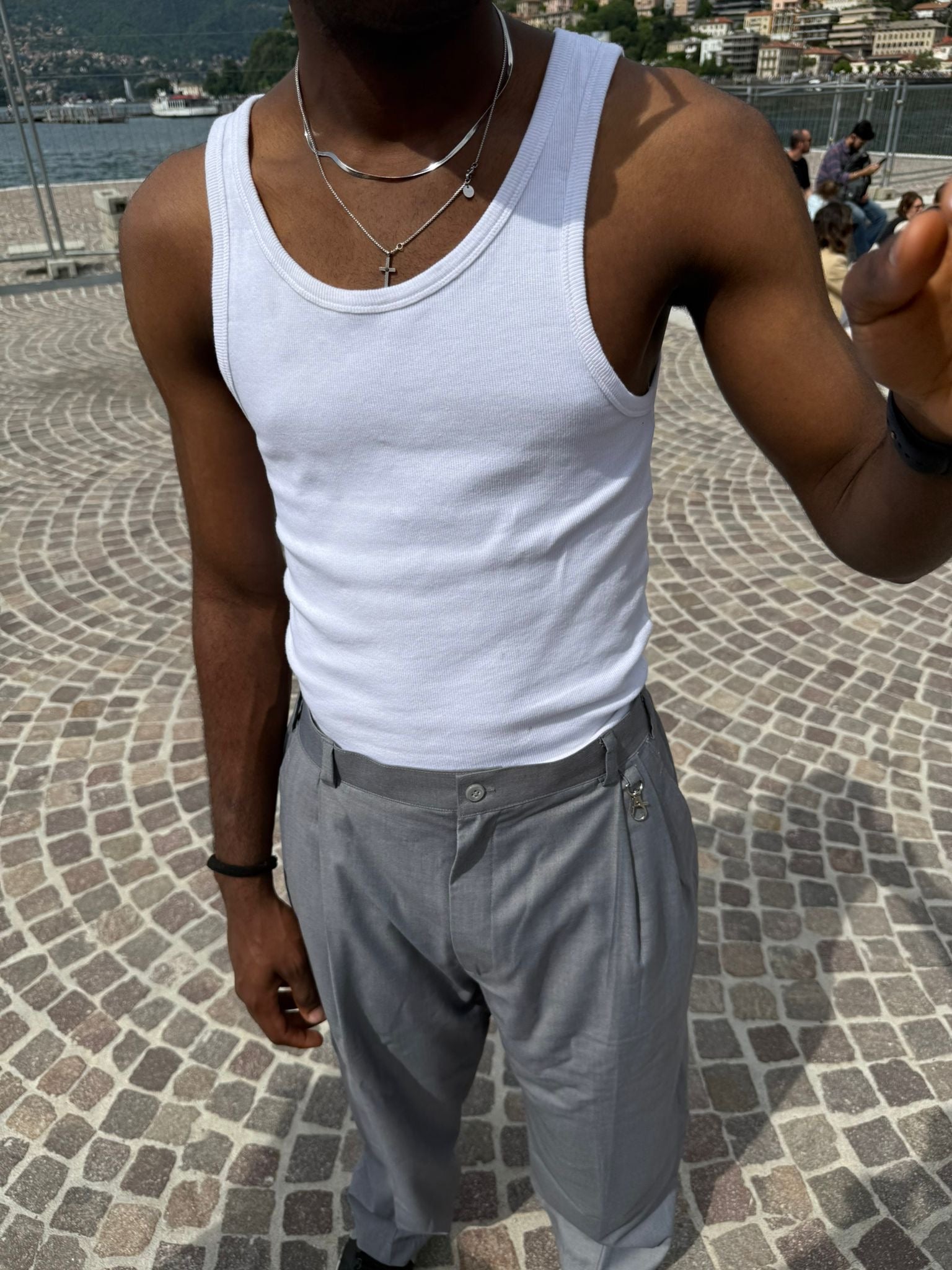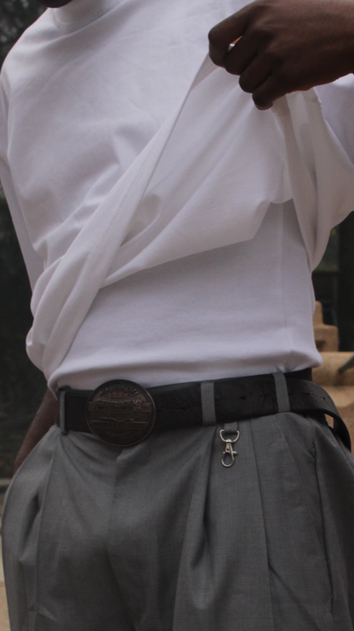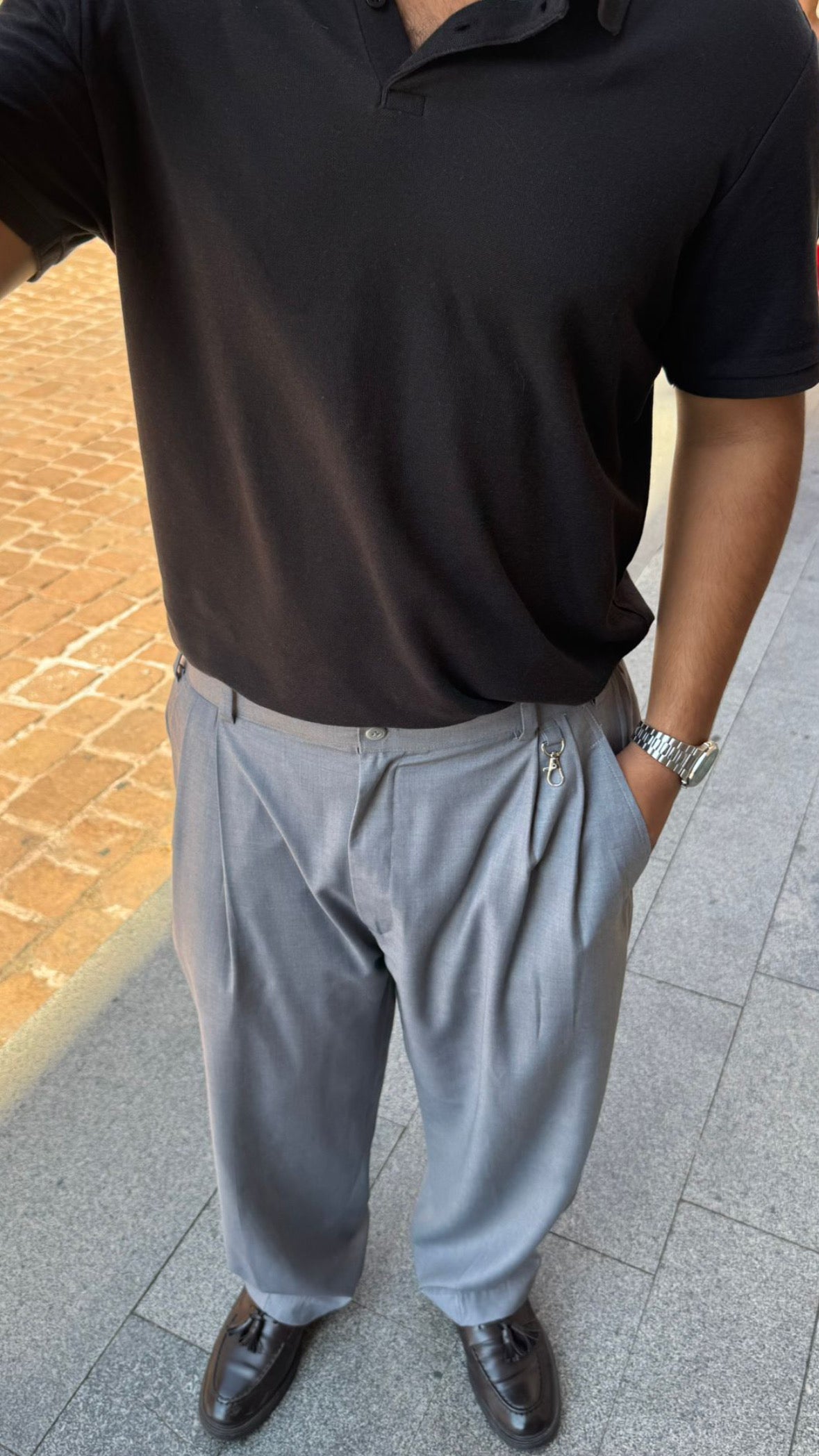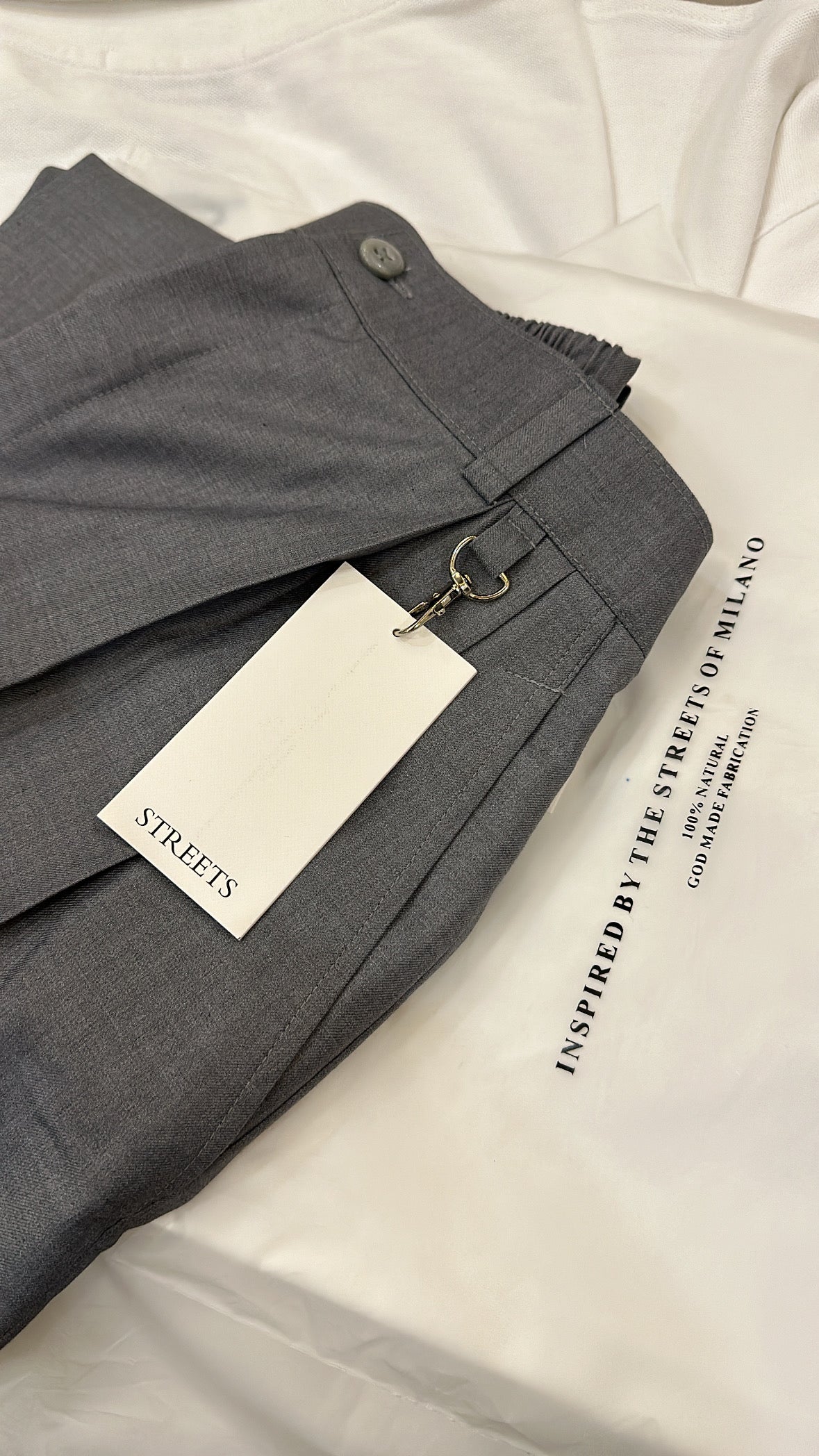 These iron grey big ol’ pants come with metal lobster clasps & double front pleats. The back pocket features a classic Italian-inspired flap with a button.