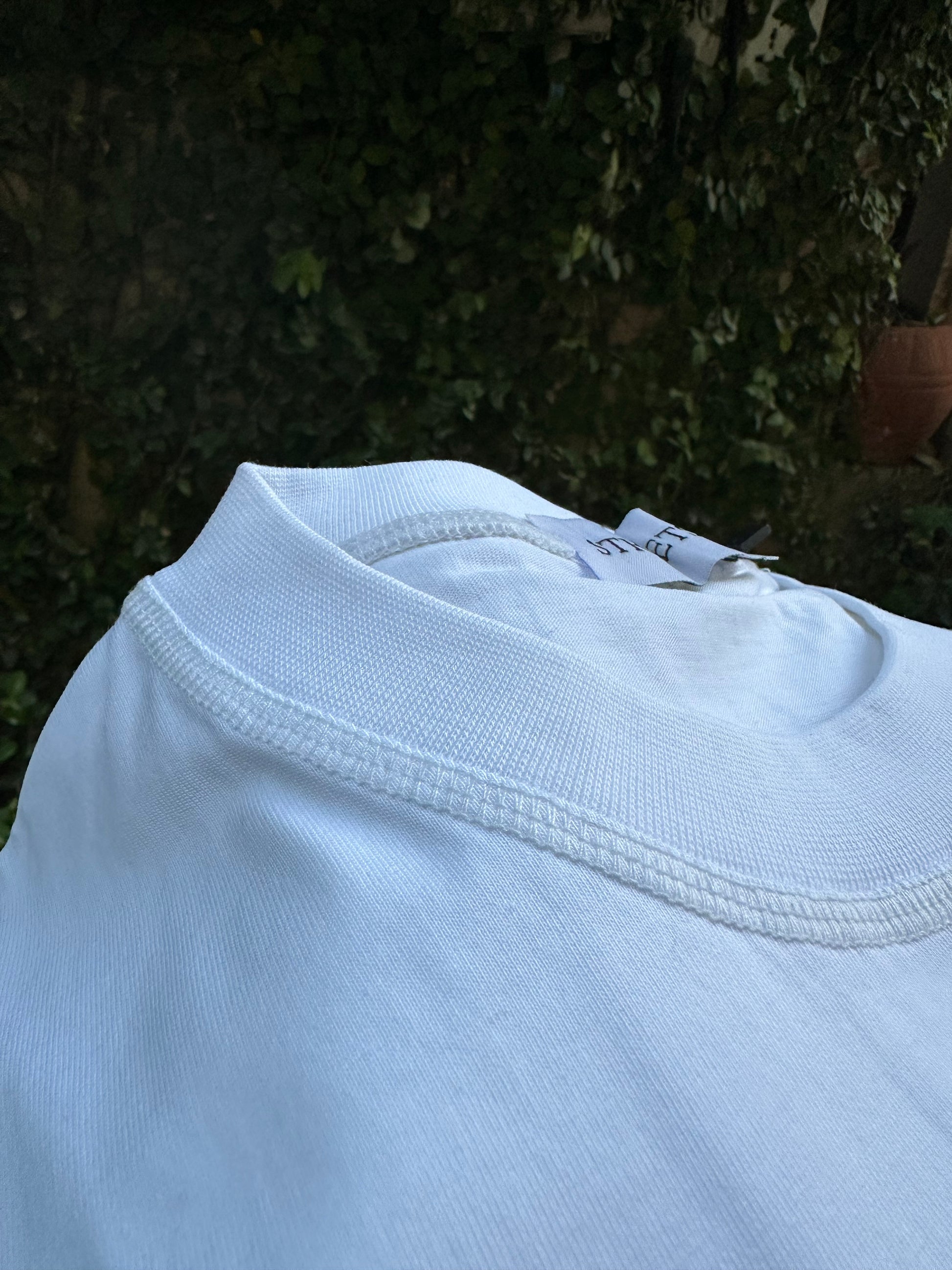 This is our Box Fit T-shirt (cropped) in crisp white, made from a luxury heavyweight 100% combed cotton jersey coming in at 250gsm (+\-20).